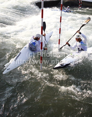 : Second placed team of France with Pierre Bourliaud, Boris Neveu and Fabien Lefevre during final run of men K-1 team race of ICF Canoe Slalom World Championships 2010, which was held in Tacen, Slovenia, on Sunday, 12th of September 2010.