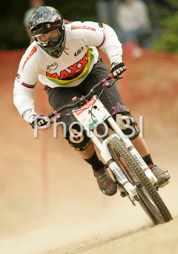 : Winner Sabrina Jonnier of France during women final run of first Downhill MTB World Cup 2008. First women race of UCI Nissan Mountain Bike World Cup 2008 was held in Maribor, Slovenia, on 11th of May 2008.