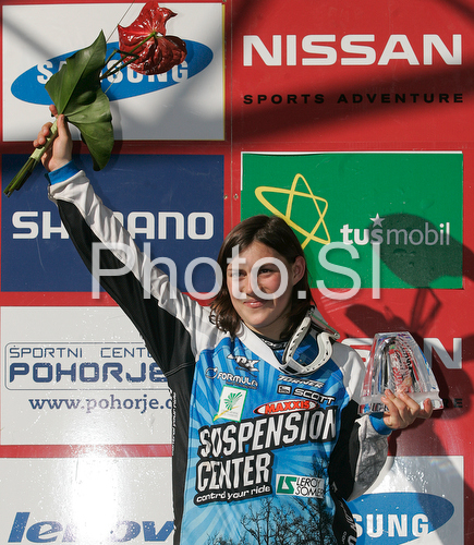 : Third placed Emmeline Ragot of France celebrating her victory in women final run of first Downhill MTB World Cup 2008. First women race of UCI Nissan Mountain Bike World Cup 2008 was held in Maribor, Slovenia, on 11th of May 2008.