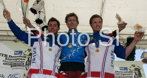 Kranjska Gora ,Slovenia - 14.06.2009 : Winner Nick Beer of Switzerland (M), second placed Aurelien Giordanengo of France (L) and third placed Remi Thirion of France (R) celebrate their medals won in Mountain Bike Downhill European Championships in Kranjska Gora, Slovenia. MTB Downhill European Championships was held on Sunday, 14th of June 2009 in Kranjska Gora, Slovenia. Photo by: Primoz Jeroncic