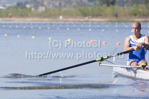 : BRAAS Roel (NED) hits a discarded water bottle whilst competing in the Mens Single Sculls at the 2010 European Rowing Championships held at the aquatic centre, Montemor-o-Velho, Portugal.