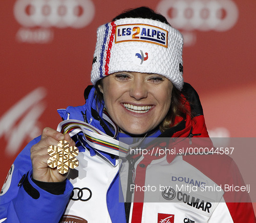 Schladming ,Austria - 10.02.2013 : Winner Marion Rolland of France celebrates her medal won in the Ladies Downhill race of Fis Alpine World Ski Championships 2013 Schladming, Austria. Ladies Downhill race of Fis Alpine World Ski Championships 2013 Schladming, was held on Sunday, 10th of February, 2013, on course Streicher in Schladming, Austria. Photo by: Mitja Smid Bricelj/PhotoSI