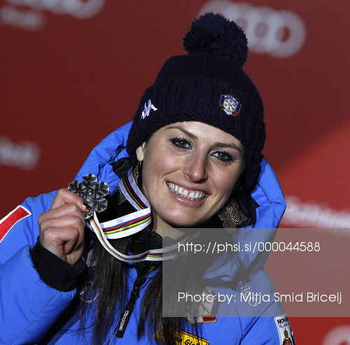 : Second placed Nadia Fanchini of Italy celebrates her medal won in the Ladies Downhill race of Fis Alpine World Ski Championships 2013 Schladming, Austria. Ladies Downhill race of Fis Alpine World Ski Championships 2013 Schladming, was held on Sunday, 10th of February, 2013, on course Streicher in Schladming, Austria.
