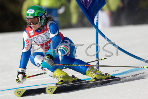 : Denise Karbon of Italy clears a gate in the first run of FIS women alpine skiing World Cup giant slalom race in Ofterschwang, Germany. Giant slalom World cup race in Ofterschwang, Germany, was held on 26th of January 2008.