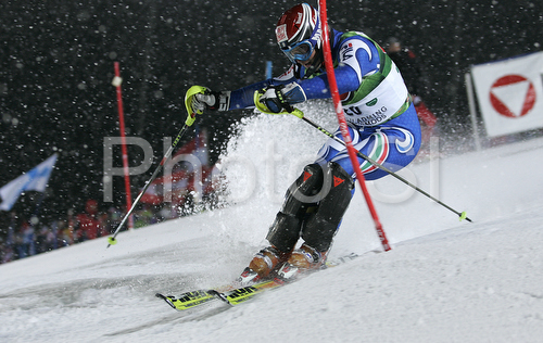 : Cristian Deville of Italy skiing in first run of men slalom World Cup race in Schladming, Austria. Slalom race of traditional Schladming Night race and Men FIS Alpine skiing World Cup was held in Schladming, Austria, on 22nd of January 2008.