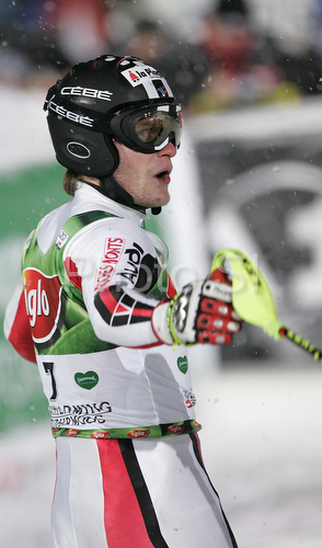 : Julien Lizeroux of France reacts in finish of second run of men slalom World Cup race in Schladming, Austria. Slalom race of traditional Schladming Night race and Men FIS Alpine skiing World Cup was held in Schladming, Austria, on 22nd of January 2008.