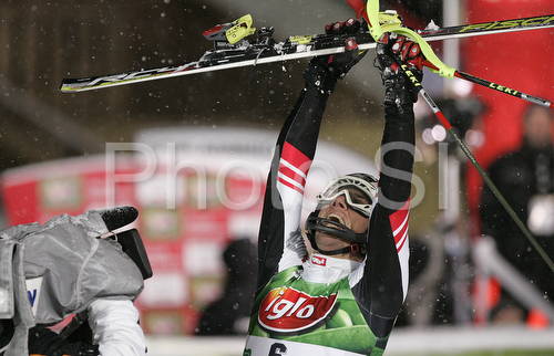 : Winner Mario Matt of Austria reacts in finish of second run of men slalom World Cup race in Schladming, Austria. Slalom race of traditional Schladming Night race and Men FIS Alpine skiing World Cup was held in Schladming, Austria, on 22nd of January 2008.