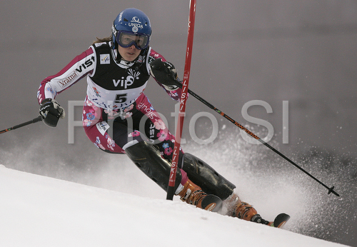 : Veronika Zuzulova of Slovakia skiing in first run of women slalom World Cup race in Zagreb, Croatia. Slalom race of Snow Queen Trophy 2008 and Women FIS Alpine skiing World Cup was held in Zagreb, Croatia, on 15th of February 2008.