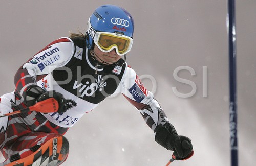 : Third placed after first run Tanja Poutiainen of Finland skiing in first run of women slalom World Cup race in Zagreb, Croatia. Slalom race of Snow Queen Trophy 2008 and Women FIS Alpine skiing World Cup was held in Zagreb, Croatia, on 15th of February 2008.