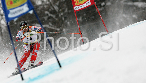 : Jukka Leino of Finland skiing in first run of men giant slalom World Cup race in Kranjska Gora, Slovenia. Giant slalom race of Men FIS Alpine skiing World Cup was held in Kranjska Gora, Slovenia, on 8th of March 2008.