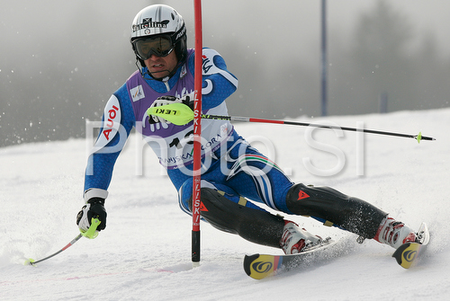 : Giorgio Rocca of Italy skiing in first run of men slalom World Cup race in Kranjska Gora, Slovenia. Slalom race of Men FIS Alpine skiing World Cup was held in Kranjska Gora, Slovenia, on 9th of March 2008.