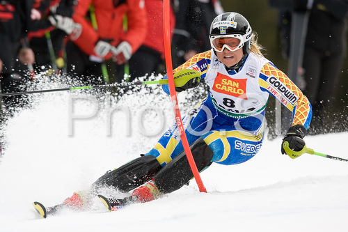 : Anja Paerson of Sweden clears a gate during the womens alpine ski World Cup finals slalom race in Bormio, Italy, Friday, March 14, 2008.
