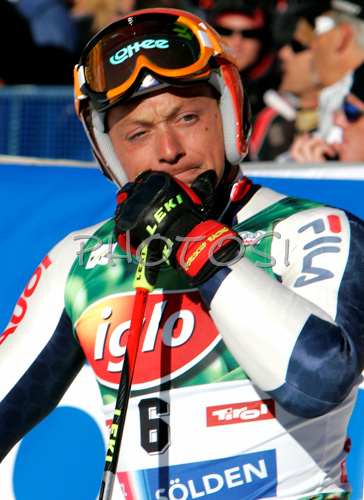: Massimiliano Blardone of Italy reacts in finish of second run of Men giant slalom Audi FIS Ski World Cup 2008-09 opening race. First race of Men Audi FIS Ski World Cup season 2008-09 was held on Sunday, 26th of October 2008 in Soelden, Austria.