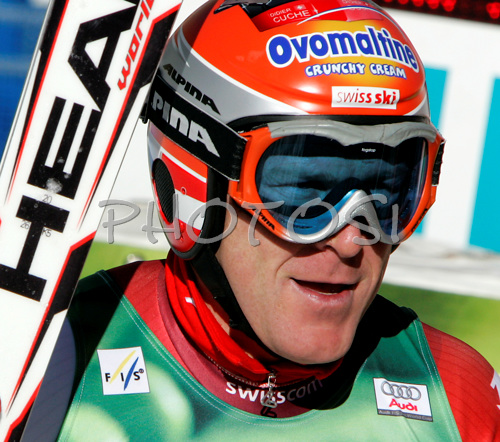 : Didier Cuche of Switzerland reacts in finish of second run of Men giant slalom Audi FIS Ski World Cup 2008-09 opening race. First race of Men Audi FIS Ski World Cup season 2008-09 was held on Sunday, 26th of October 2008 in Soelden, Austria.