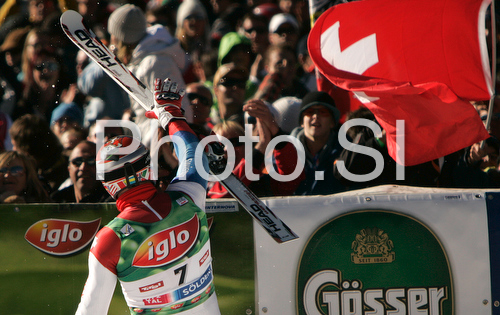 : Second placed Didier Cuche of Switzerland reacts in finish of second run of Men giant slalom Audi FIS Ski World Cup 2008-09 opening race. First race of Men Audi FIS Ski World Cup season 2008-09 was held on Sunday, 26th of October 2008 in Soelden, Austria.