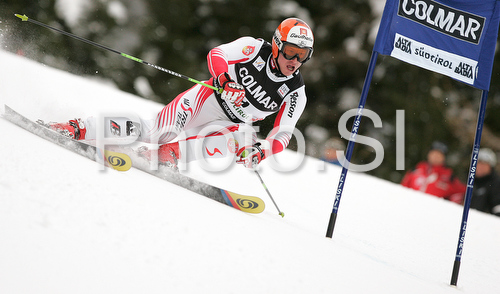 : Hannes Reichelt of Austria skiing in first run of Alta Badia Men giant slalom race of Audi FIS Ski World Cup 2008-09. Giant slalom race of Men Audi FIS Ski World Cup 2008-09 was traditionally held on Gran Risa course in Alta Badia, Italy, on Sunday, 21st of December 2008.