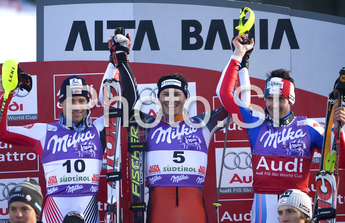 : From left third placed Benjamin Raich of Austria, winner Ivica Kostelic of Croatia and second placed Jean-Baptiste Grange of France celebrate on the podium after the mens alpine ski World Cup Slalom race in Alta Badia, Italy, Monday, December 22, 2008.