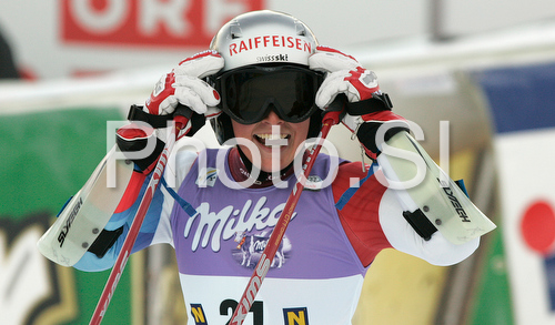 : Third placed Lara Gut of Switzerland reacts in finish of second run of Semmering women giant slalom race of Audi FIS Ski World Cup 2008-09. Giant slalom race of Women Audi FIS Ski World Cup 2008-09 was held Semmering, Austria, on Sunday, 28th of December 2008.