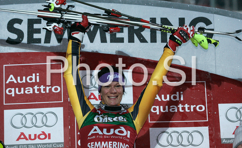 : celebrates her medals won in Semmering women slalom race of Audi FIS Ski World Cup 2008-09. Slalom race of Women Audi FIS Ski World Cup 2008-09 was held Semmering, Austria, on Monday, 29th of December 2008.