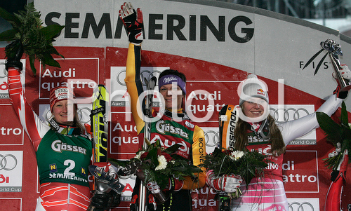 : Winner Maria Riesch of Germany (M), second placed Tanja Poutiainen of Finland (L) and third placed Lindsey Vonn of USA (R) celebrate their medals won in Semmering women slalom race of Audi FIS Ski World Cup 2008-09. Slalom race of Women Audi FIS Ski World Cup 2008-09 was held Semmering, Austria, on Monday, 29th of December 2008.