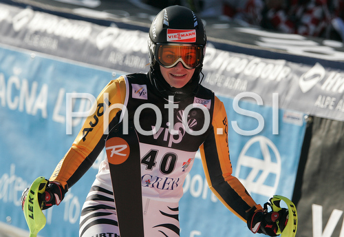 : Christina Geiger of Germany reacts in finish of second run of Zagreb women slalom race of Audi FIS Ski World Cup 2008-09. Slalom race of Women Audi FIS Ski World Cup 2008-09 was held Zagreb, Croatia, on Sunday, 4th of January 2009.