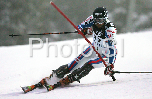 : Stephane Tissot of France skiing in first run of Zagreb men slalom race of Audi FIS Ski World Cup 2008-09. Slalom race of Men Audi FIS Ski World Cup 2008-09 was held on Sljeme above Zagreb, Croatia, on Tuesday, 6th of January 2009.