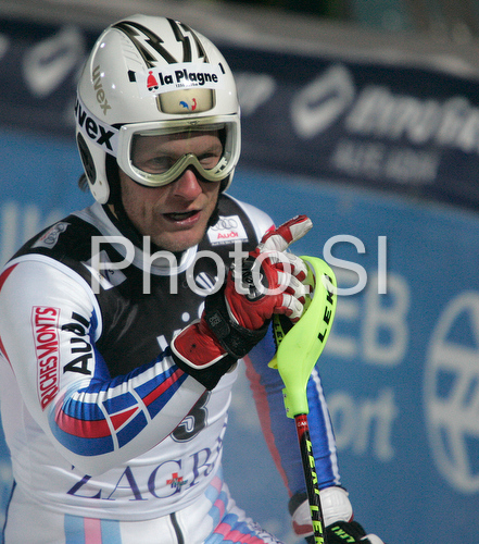 : Ninth placed Julien Lizeroux of France reacts in finish of second run of Zagreb men slalom race of Audi FIS Ski World Cup 2008-09. Slalom race of Men Audi FIS Ski World Cup 2008-09 was held on Sljeme above Zagreb, Croatia, on Tuesday, 6th of January 2009.
