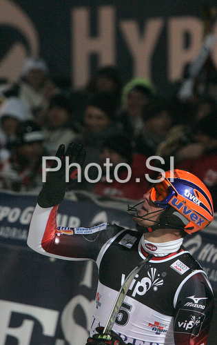 : Second placed Ivica Kostelic of Croatia reacts in finish of second run of Zagreb men slalom race of Audi FIS Ski World Cup 2008-09. Slalom race of Men Audi FIS Ski World Cup 2008-09 was held on Sljeme above Zagreb, Croatia, on Tuesday, 6th of January 2009.