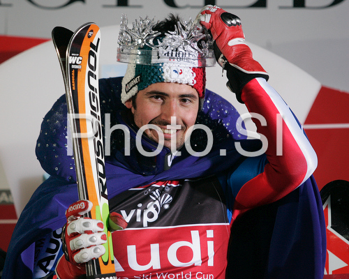 Zagreb ,Croatia - 06.01.2009 : Winner Jean-Baptiste Grange of France celebrates his medal won in Zagreb men slalom race of Audi FIS Ski World Cup 2008-09. Slalom race of Men Audi FIS Ski World Cup 2008-09 was held on Sljeme above Zagreb, Croatia, on Tuesday, 6th of January 2009. Photo by: Primoz Jeroncic