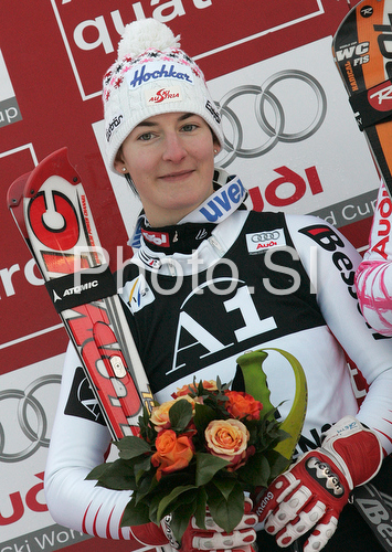 : Second placed Kathrin Zettel of Austria celebrates her medal won in Zauchenee women super combined race of Audi FIS Ski World Cup 2008-09. Downhill part of super combined race of Women Audi FIS Ski World Cup 2008-09 was held in Zauchensee, Austria on Saturday, 17th of January 2009.