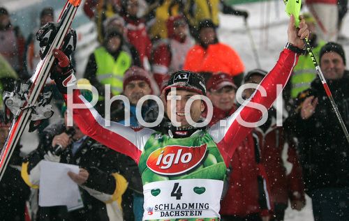 : Winner Reinfried Herbst of Austria celebrates his medal won in Men slalom race of Schladming Audi FIS Ski World Cup 2008-09. Schladming slalom Nightrace of Men Audi FIS Ski World Cup 2008-09 was held in Schladming, Austria on Sunday, 27th of January 2009.