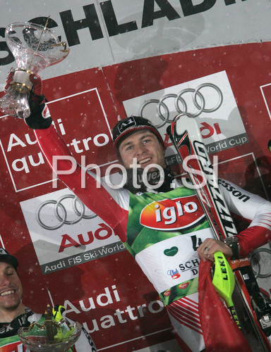 : Winner Reinfried Herbst of Austria celebrates his medal won in Men slalom race of Schladming Audi FIS Ski World Cup 2008-09. Schladming slalom Nightrace of Men Audi FIS Ski World Cup 2008-09 was held in Schladming, Austria on Sunday, 27th of January 2009.