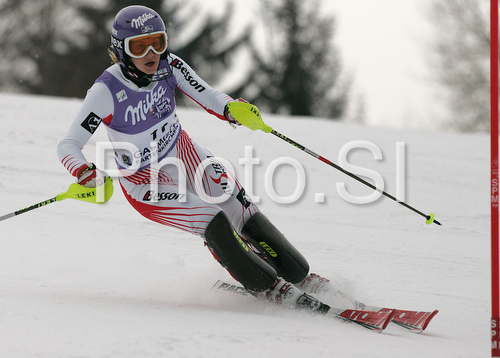 : Second placed after first run Michaela Kirchgasser of Austria skiing in first run of Women slalom race of Garmisch-Partenkirchen Audi FIS Ski World Cup 2008-09. Garmisch-Partenkirchen slalom Women Audi FIS Ski World Cup 2008-09 was held in Garmisch-Partenkirchen on Friday, 30th of January 2009.