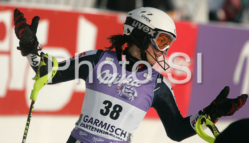 : Irene Curtoni of Italy reacts in finish of second run of Women slalom race of Garmisch-Partenkirchen Audi FIS Ski World Cup 2008-09. Garmisch-Partenkirchen slalom Women Audi FIS Ski World Cup 2008-09 was held in Garmisch-Partenkirchen on Friday, 30th of January 2009.