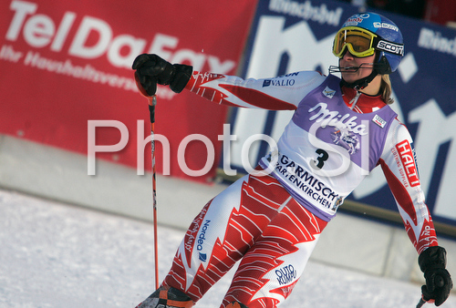: Ninth placed Tanja Poutiainen of Finland reacts in finish of second run of Women slalom race of Garmisch-Partenkirchen Audi FIS Ski World Cup 2008-09. Garmisch-Partenkirchen slalom Women Audi FIS Ski World Cup 2008-09 was held in Garmisch-Partenkirchen on Friday, 30th of January 2009.