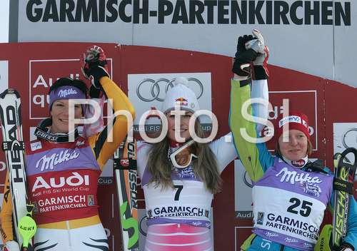 : Winner Lindsey Vonn of USA (M), second placed Maria Riesch of Germany (L) and third placed Marusa Ferk of Slovenia (R) celebrates their medals won in Women slalom race of Garmisch-Partenkirchen Audi FIS Ski World Cup 2008-09. Garmisch-Partenkirchen slalom Women Audi FIS Ski World Cup 2008-09 was held in Garmisch-Partenkirchen on Friday, 30th of January 2009.
