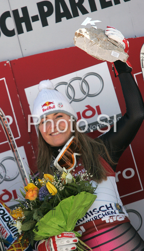 : Winner Lindsey Vonn of USA celebrates her medal won in Women Super-G race of Garmisch-Partenkirchen Audi FIS Ski World Cup 2008-09. Garmisch-Partenkirchen Super-G race of Women Audi FIS Ski World Cup 2008-09 was held in Garmisch-Partenkirchen on Sunday, 1st of February 2009.