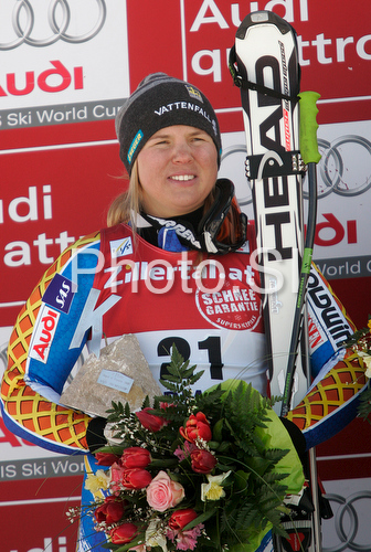 Garmisch-Partenkirchen ,Germany - 01.02.2009 : Second placed Anja Paerson of Sweden celebrates her medal won in Women Super-G race of Garmisch-Partenkirchen Audi FIS Ski World Cup 2008-09. Garmisch-Partenkirchen Super-G race of Women Audi FIS Ski World Cup 2008-09 was held in Garmisch-Partenkirchen on Sunday, 1st of February 2009. Photo by: Tomaz Jeroncic