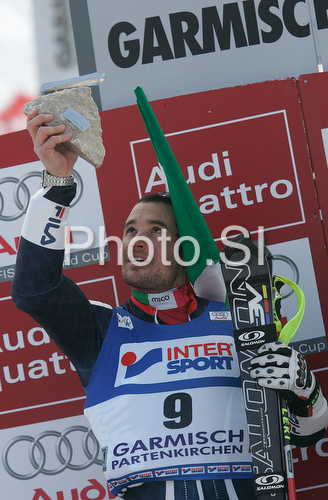 : Second placed Giorgio Rocca of Italy celebrates his medal won in Men slalom race of Garmisch-Partenkirchen Audi FIS Ski World Cup 2008-09. Garmisch-Partenkirchen slalom Men Audi FIS Ski World Cup 2008-09 was held in Garmisch-Partenkirchen on Sunday, 1st of February 2009.