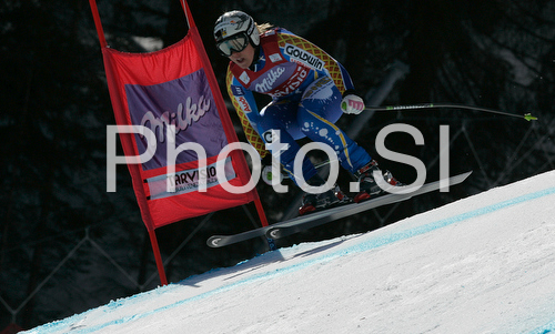 : Anja Paerson of Sweden skiing in downhill part of Women Super combined race of Tarvisio Audi FIS Ski World Cup 2008-09. Super combined race of Women Audi FIS Ski World Cup 2008-09 was held in Tarvisio, Italy on Friday, 20th of February 2009.