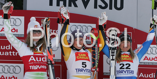 Tarvisio ,Italy - 21.02.2009 : Winner Gina Stechert of Germany (M), second placed Lindsey Vonn of USA (L) and third placed Anja Paerson of Sweden (R) celebrate their medals won in Women Downhill race of Tarvisio Audi FIS Ski World Cup 2008-09. Downhill race of Women Audi FIS Ski World Cup 2008-09 was held in Tarvisio, Italy on Saturdayday, 21st of February 2009. Photo by: Mitja Smid Bricelj