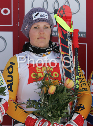 : Winner Gina Stechert of Germany celebrates her medal won in Women Downhill race of Tarvisio Audi FIS Ski World Cup 2008-09. Downhill race of Women Audi FIS Ski World Cup 2008-09 was held in Tarvisio, Italy on Saturdayday, 21st of February 2009.