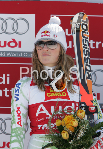 : Second placed Lindsey Vonn of USA celebrates her medal won in Women Downhill race of Tarvisio Audi FIS Ski World Cup 2008-09. Downhill race of Women Audi FIS Ski World Cup 2008-09 was held in Tarvisio, Italy on Saturdayday, 21st of February 2009.