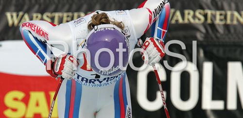 : Ingrid Jacquemod of France reacts in finish of Women Downhill race of Tarvisio Audi FIS Ski World Cup 2008-09. Downhill race of Women Audi FIS Ski World Cup 2008-09 was held in Tarvisio, Italy on Saturdayday, 21st of February 2009.