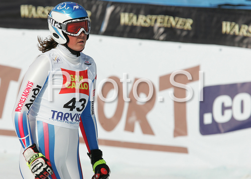 : Clothilde Weyrich of France reacts in finish of Women Downhill race of Tarvisio Audi FIS Ski World Cup 2008-09. Downhill race of Women Audi FIS Ski World Cup 2008-09 was held in Tarvisio, Italy on Saturdayday, 21st of February 2009.