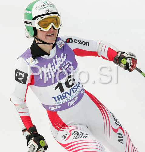 : Tenth placed Elisabeth Goergl of Austria reacts in finish of Women Super-G race of Tarvisio Audi FIS Ski World Cup 2008-09. Downhill race of Women Audi FIS Ski World Cup 2008-09 was held in Tarvisio, Italy on Sunday, 22nd of February 2009.