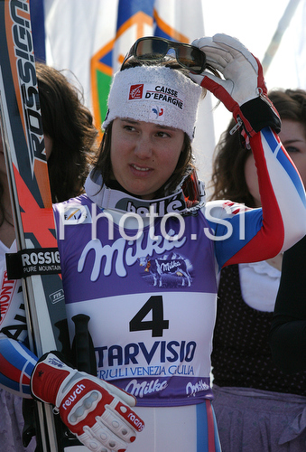 : Tenth placed Marie Marchand-Arvier of France celebrates her success in Women Super-G race of Tarvisio Audi FIS Ski World Cup 2008-09. Downhill race of Women Audi FIS Ski World Cup 2008-09 was held in Tarvisio, Italy on Sunday, 22nd of February 2009.