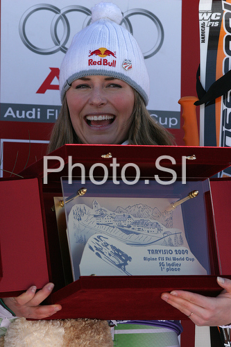 : Winner Lindsey Vonn of USA celebrates her medal won in Women Super-G race of Tarvisio Audi FIS Ski World Cup 2008-09. Downhill race of Women Audi FIS Ski World Cup 2008-09 was held in Tarvisio, Italy on Sunday, 22nd of February 2009.