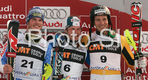 : Winner Julien Lizeroux of France (M), second placed Giuliano Razzoli of Italy (L) and third placed Felix Neureuther of Germany (R) celebrate their medals won in Men slalom race of Kranjska Gora Audi FIS Ski World Cup 2008-09. Slalom race of Men Audi FIS Ski World Cup 2008-09 was held in Kranjska Gora, Slovenia, on Sunday, 1st of March 2009.