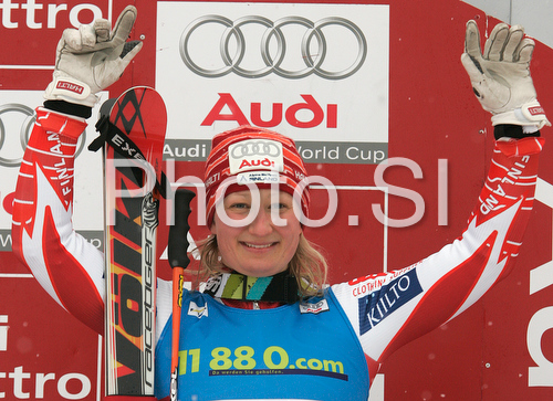 Ofterschwang ,Germany - 06.03.2009 : Third placed Tanja Poutiainen of Finland celebrates her medal won in Women giant slalom race of Ofterschwang Audi FIS Ski World Cup 2008-09. Giant slalom race of Women Audi FIS Ski World Cup 2008-09 was held in Ofterschwang, Germany, on Friday, 6th of March 2009. Photo by: Primoz Jeroncic